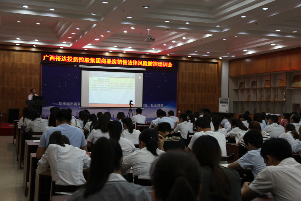 为规避商品房销售各环节存在的法律风险,做好销售过程中的法律风险防控,加强销售人员风险防范意识及风险防范能力,为进一步实现集团公司“以经营现金流为基础”,加快推行企业“强管理”模式,进一步实施管控变革,全面加速商业去库的核心理念,集团法务部于2018年6月1日晚在集团七楼大会议室开展商品房销售风险防控培训会,集团销售体系100多位销售人员参加培训,武宣、象州、投资公司视频参训,本次培训由集团法务部副经理谢家伟先生主讲。