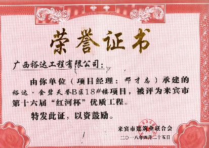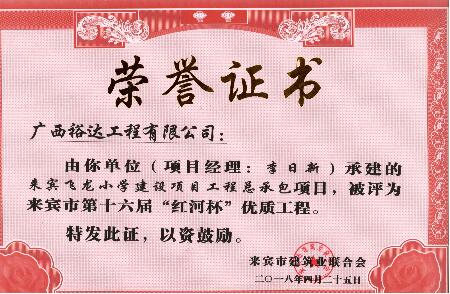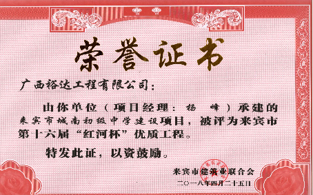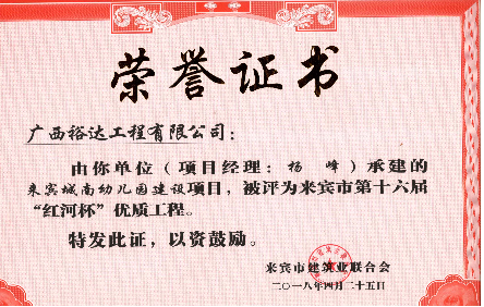 近期,从来宾市建筑业联合会传来喜讯,开云集团有限公司承建的“来宾城南幼儿园建设项目”“来宾市城南初级中学建设项目”“来宾飞龙小学建设项目工程总承包”“裕达·金碧天誉B区17#楼”和“裕达·金碧天誉B区18#楼”共5项工程项目被评为来宾市第十六届“红河杯”优质工程,这是继2011年至2017年荣获的25项“红河杯”优质工程之后,再获此荣誉。