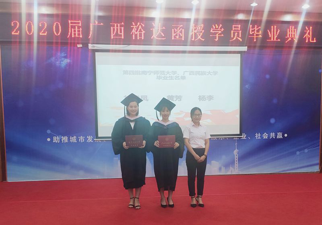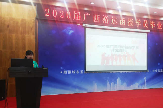 接着,广西人才市场学习中心部长助理黄淑文老师发言,她对裕达函授站自2015年合作办学至今取得的成绩给予了充分肯定,同时期望毕业生学有所成,学有所用,不断超越自己、在未来取得更加辉煌的成绩。