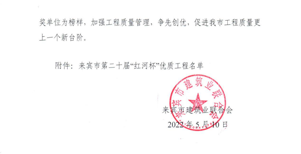 来宾市“红河杯”优质工程是根据地方地方政府及业内组织有关规定,经严格评审,表彰来宾市辖区内从建筑、工程建设、服务提供、环境保护等行业质量领先、技术创新、品牌优秀、效益突出的组织。