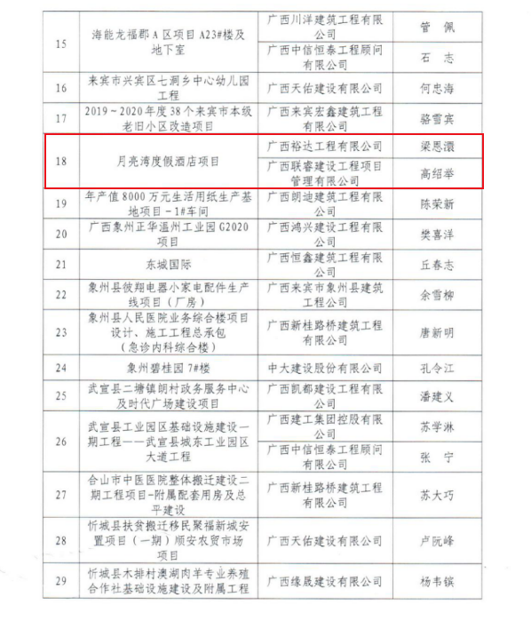 5月10日,来宾市建筑业联合会印发《关于公布来宾市第二十届“红河杯”优质工程名单的通知》,开云集团有限公司承建的来宾市烈士陵园项目、裕达•裕嘉园5#楼(不含地下室)、裕达•翡翠园3#楼(不含地下室)等共8个项目荣获来宾市第二十届“红河杯”优质工程奖。