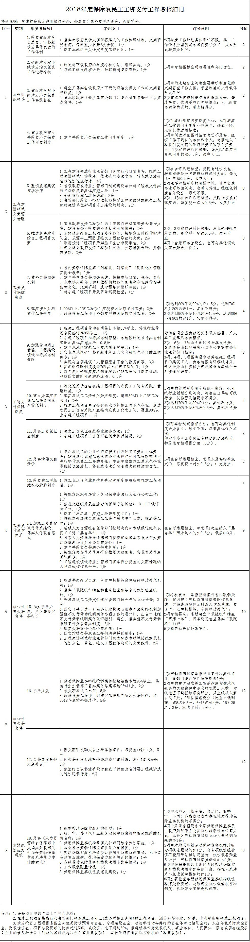 据人社部网站9月10日消息,为强化对保障农民工工资支付工作的组织领导,进一步落实治理拖欠农民工工资问题的属地责任,根据《国务院办公厅关于印发保障农民工工资支付工作考核办法的通知》(国办发〔2017〕96号),近日,解决企业工资拖欠问题部际联席会议印发《2018年度保障农民工工资支付工作考核细则》(以下简称《考核细则》),部署对各省、自治区、直辖市人民政府及新疆生产建设兵团2018年度保障农民工工资支付工作进行年度考核。