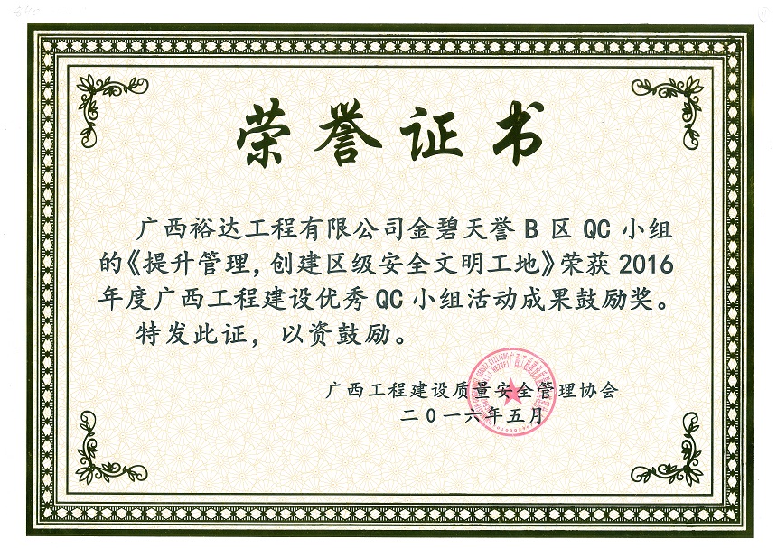2016年度广西工程建设优秀QC小组活动成果鼓励奖《提升管理,创建区级安全文明工地》-金碧天誉B区