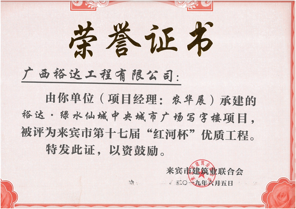 裕达·绿水仙城中央城市广场写字楼项目评为来宾市第十七届“红河杯”优质工程(项目经理:农华展)